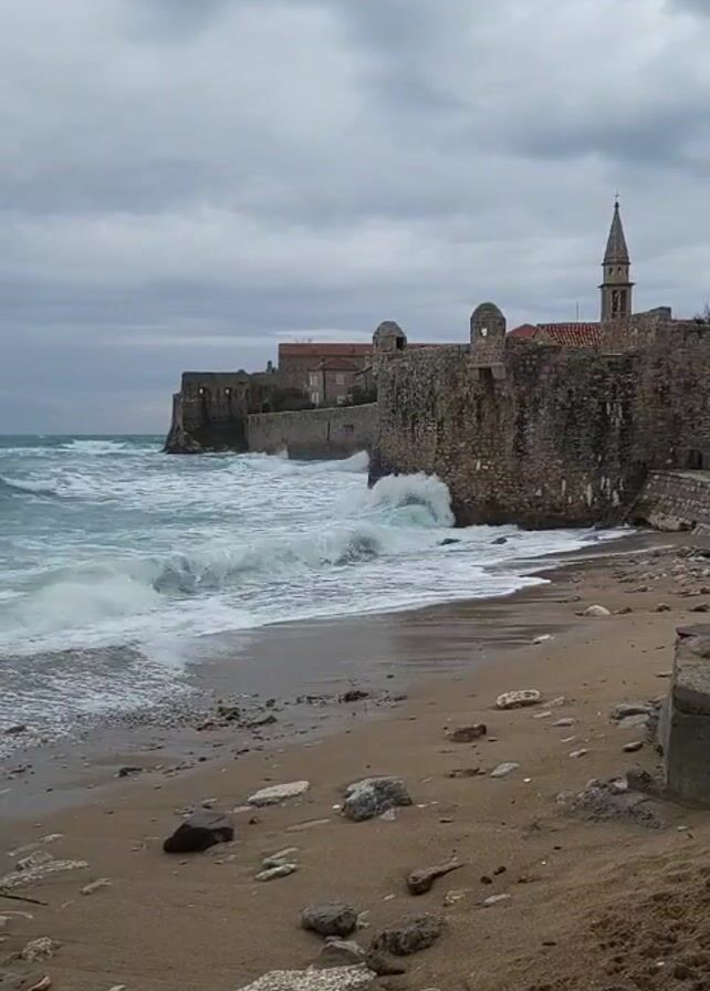 coastal scene with a beach, a medieval town wall, and a church tower under a cloudy sky. The beach is sandy with scattered rocks and debris. Waves crash against the shore and the base of the town wall. The town wall, made of stone, features visible battlements and embrasures. In the background, a church tower rises above the town, recognizable by its pointed spire. The sky is overcast, creating a gray, muted atmosphere. There is no visible human activity.