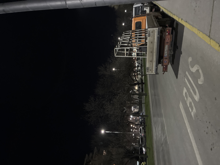 The image captures an urban street scene at night in Plovdiv, Bulgaria. In the foreground on the right, a grey cylindrical pole is partially visible. An asphalt road surface runs horizontally, featuring the white painted word "BUS" in the lower foreground. A solid yellow line separates the road from a paved curb on the right, where an orange flatbed truck with a white cab is parked. The truck displays a Bulgarian license plate "PB 0669 CT" on its rear. The truck's bed contains a large, multi-compartment white metal rack structure. A white van is partially visible parked behind the orange truck. Across the road, a median strip with sparse vegetation is lined by numerous leafless deciduous trees. Beyond these trees, a parallel street or parking area is visible, containing multiple parked vehicles, including several light-colored cars, with their headlights or taillights illuminated. A multi-story building is partially discernible on the far left. The entire scene is illuminated by numerous streetlights, appearing as bright points of light across the midground and background. The sky is dark and clear, indicating nighttime. No people are visible.