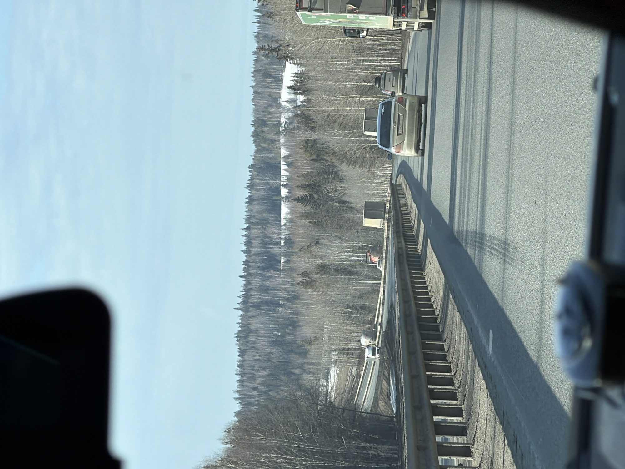 The image presents a forward-facing view from inside a moving vehicle on an asphalt highway in Revda, Russia. The scene depicts a late winter or early spring landscape under a light blue sky with minimal cloud cover. In the immediate foreground, a blurry section of a rearview mirror is visible at the top-left, and the vehicle's dashboard occupies the bottom edge of the frame. The highway has multiple lanes in the direction of travel, with visible tire tracks on the asphalt surface. A metal guardrail runs along the left side of the road. Several vehicles are in motion: a light-colored sedan (bearing Russian license plate X202OB196) travels in the left lane, followed by a dark SUV in the right lane. The rear of a green-sided semi-truck is partially visible on the far right. On a separate, lower section of the road to the left, two tanker trucks (one white, one red-orange) and another white truck are observed. The background features undulating hills densely covered in forest. The trees are predominantly bare deciduous species, giving a grayish-white appearance, interspersed with darker evergreen conifers. Patches of snow are visible on the ground, particularly on the hillsides and in shadowed areas.