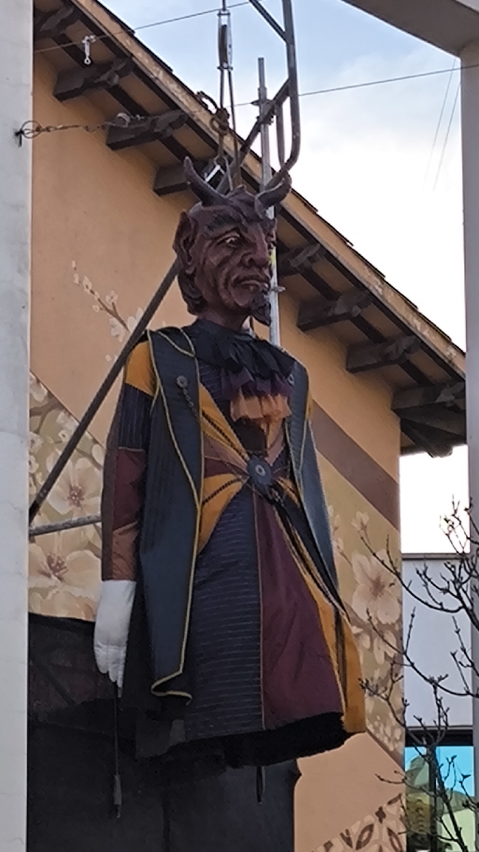 - "A devil-like effigy with horns is suspended from a metal apparatus attached to the eaves of a peach-colored building" by FM-WId4x1, licensed under CC BY 4.0