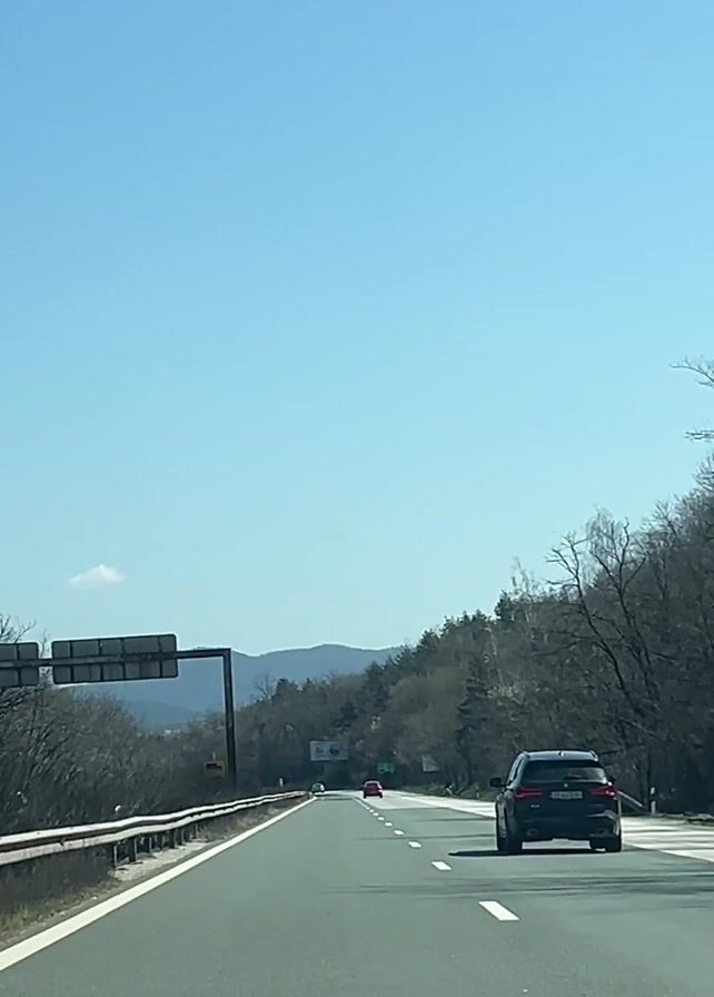 view from a vehicle driving on a highway. A black SUV is in the lane to the right, slightly ahead of the camera car. In the distance, another car, possibly red, is visible further down the highway. The highway is bordered by trees on the right and a metal barrier on the left. Mountains can be seen in the distance under a clear blue sky. There is an overhead road sign. The weather is sunny.