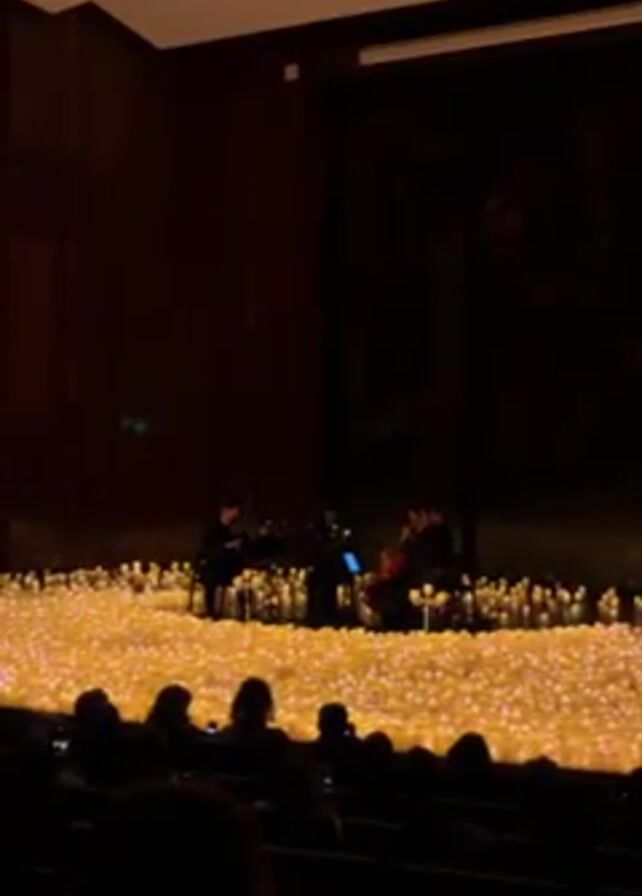 The video captures a performance in an auditorium. In the foreground, an audience is seated, holding up their phones. The stage is decorated with a sea of small lights, most likely candles, creating a warm, glowing surface. On the stage are four musicians, three visible, playing stringed instruments, possibly violins and a cello. The lighting is dim except for the stage, emphasizing the performers and candles. The background shows the auditorium's dark wooden walls and the stage's curtains. The overall scene evokes a formal and intimate musical experience.