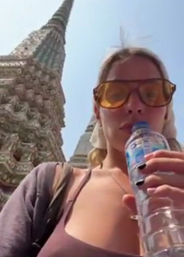 A woman with blonde hair and wearing large, yellow-tinted sunglasses is taking a drink from a clear plastic water bottle. She is wearing a maroon tank top and a dark cardigan or sweater. She also has a backpack slung over one shoulder. The background shows a clear, blue sky and ornate, spired Buddhist architecture, suggesting a temple complex in Thailand. The video is shot from a low angle, looking up at the woman and the architecture.