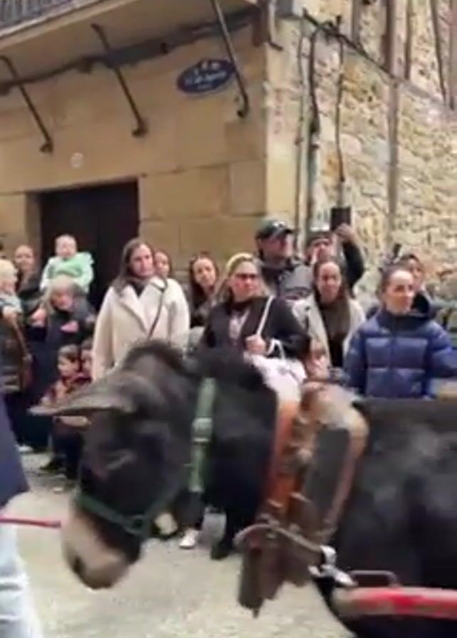 donkey pulling a small wagon along a cobblestone street, surrounded by onlookers