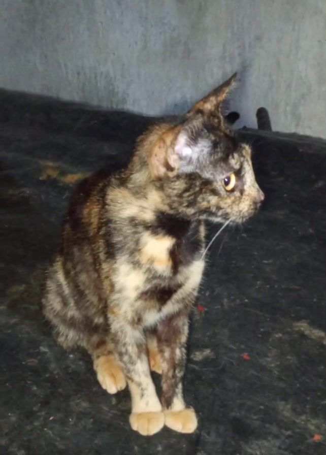 A cat sits on a black surface with a gray wall in the background. The cat has a tortoiseshell pattern with brown, black, and tan fur. It is sitting upright with its front paws neatly arranged in front of it. The cat is looking to the right. The cat's right ear is slightly bent at the tip. The lighting is somewhat dim, casting shadows on the wall behind the cat.