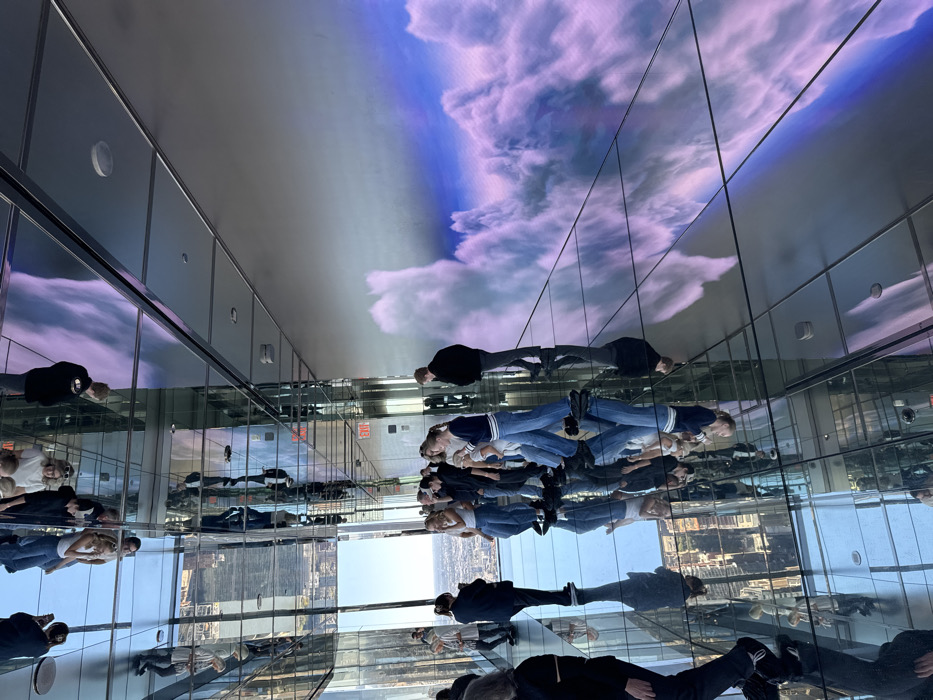 The image displays an interior scene from the Summit One Vanderbilt observation deck, located in Midtown Manhattan, New York City, United States. The environment features highly reflective surfaces, including a mirrored ceiling and a mirrored floor composed of rectangular panels, along with extensive clear glass walls. Approximately 15 to 20 individuals, including their reflections, are present. Most are adults, dressed in casual clothing such as jeans, shirts, and sweaters. One individual in the center-right holds a small child or infant. People are observed standing, walking, and looking outward through the glass windows at the visible New York City skyline and a clear blue sky. Groups of two or three individuals are seen conversing. A large digital display panel occupies the right wall, exhibiting a dynamic image of stylized clouds in purple, white, and blue hues. This cloud imagery, along with the reflections of people and external buildings, is prominently mirrored on the ceiling and floor, creating a disorienting, immersive visual effect. Metal framing and recessed lighting fixtures are visible in the ceiling structure.