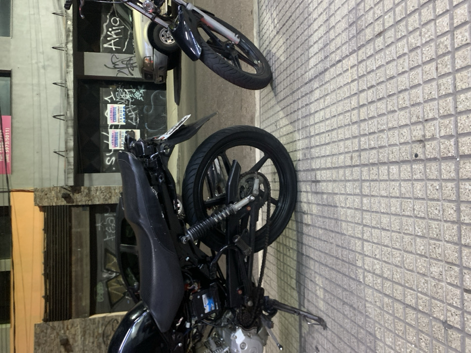 The image depicts an urban street scene at night in Vicente López, Argentina. In the foreground, a black motorcycle is parked on a light grey, grid-patterned sidewalk, positioned with its left side and rear section towards the viewer. It rests on a deployed kickstand, displaying a black multi-spoke rear wheel, a visible drive chain, rear shock absorber, an exposed blue electrical component (likely a battery), and a black passenger seat. The rear fender assembly is damaged, with a white license plate attached. To the right, the front wheel, tire, and black fender of a second motorcycle are partially visible. The background reveals a street with multiple parked vehicles and buildings. A dark-colored car is partially obscured behind the first motorcycle. Further right, a light-colored pickup truck is parked on the street. The buildings directly behind the motorcycles feature dark-colored roll-down gates or shutters extensively covered in white and light blue graffiti, including text like "SU" and "AKIO," with two "CARNAVAL" posters affixed. To the left, a building displays a stone or rough concrete facade, also marked with graffiti. Above the graffiti-covered structures, a lighter-colored building wall features a pink commercial sign with telephone numbers, "TEL: 4806 7777" and "CEL: (11) 5973/5011". Artificial lighting illuminates the scene, indicating nighttime conditions. No individuals are present in the image.