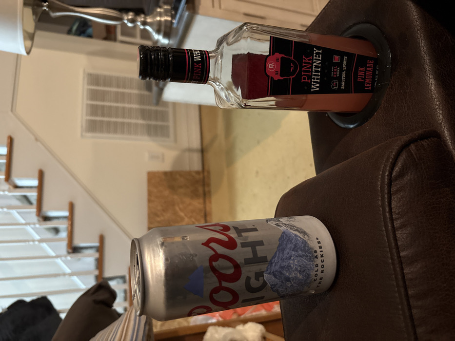 A can of Coors Light beer rests on a brown leather armrest next to a bottle of "Pink Whitney" pink lemonade vodka
