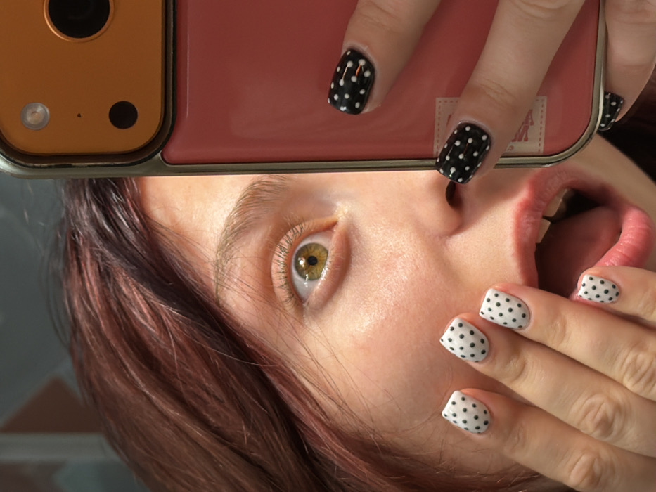 A person's face is seen upside down, pressed against a pink smartphone. The phone's camera and flash are visible in the upper left corner. The person's right eye is open, displaying a hazel iris. The mouth is slightly open, revealing the tongue and teeth. The person's fingers, adorned with black and white polka dot nail polish, frame the face. The hair is brown with pink highlights. The background is a mix of blue and beige.