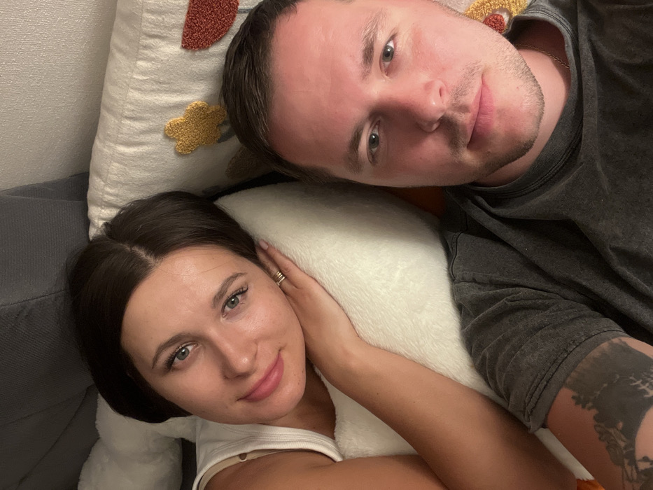 A man and a woman are lying down, possibly on a couch. The woman has dark hair and is wearing a white top. She is resting her head on a white pillow. The man has short hair and is wearing a gray shirt, with a tattoo visible on his arm. They are close together, looking at the camera. A decorative pillow with a pattern is behind them.