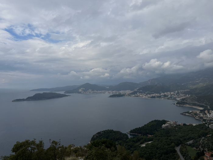 This panoramic image captures a wide, elevated view of the Montenegrin coastline, specifically from a high vantage point within the Sveti Stefan area, looking northwest along the Adriatic Sea towards Budva. The sky is predominantly overcast with varying shades of grey clouds, featuring some brighter patches and more defined cumulus formations towards the right. The central and lower portions of the image are occupied by the dark grey-blue waters of the Adriatic Sea, which appears calm. In the mid-ground, a prominent, dark green, elongated landmass, identified as Sveti Nikola Island, is situated in the bay on the left. To its right, the urbanized expanse of Budva is visible, characterized by a multitude of light-colored buildings and structures lining a crescent-shaped bay, backed by dark green, rolling mountains. Further to the right, in the mid-foreground, another coastal settlement, identified as Bečići/Rafailovići, extends along a smaller bay, featuring several large hotel or resort complexes. The far background consists of rugged mountains rising from the coastline, partially obscured by clouds and atmospheric haze. The immediate foreground is framed by dark green foliage, indicative of the elevated position from which the photograph was taken. A winding road is faintly visible among the trees in the lower right corner. No individuals or specific actions are discernible within the wide landscape.