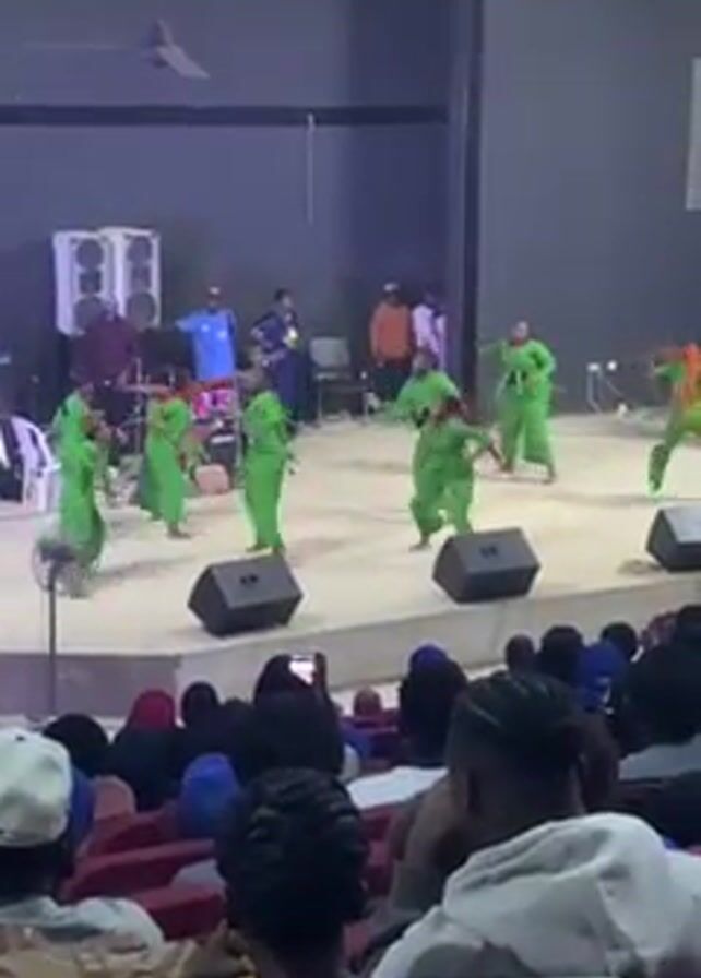 performance on a stage in front of an audience. Approximately 10 dancers dressed in green, baggy suits are performing choreographed moves. At the back of the stage, musicians are playing drums, keyboards, and other instruments. The audience is seated in rows of red seats, and some people are recording the performance on their phones. The stage is lit with stage lights and has speakers along the front. The building appears to be a large auditorium or event space.
