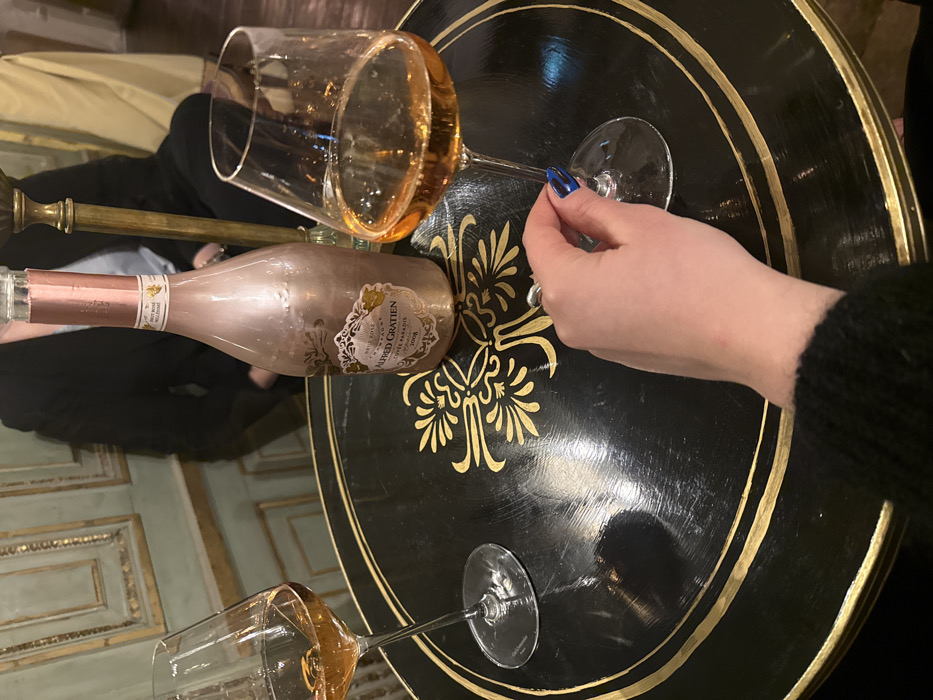 A black table with gold trim features a bottle of Alfred Gratien rosé champagne and two wine glasses, one tipped over with liquid inside. A hand with blue nails is holding the stem of one of the glasses. The table has an ornate gold design in the center. A portion of a gold-colored decorative floor and parts of people dressed in black are visible in the background.