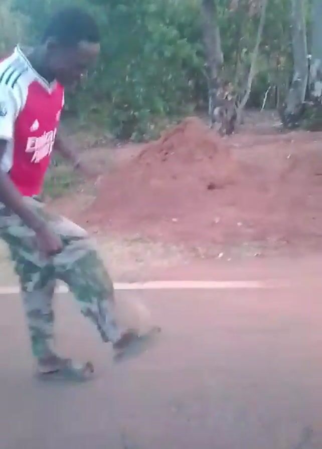 A young man stands on a paved road wearing a red and white sports jersey with the words "Emirates Fly Better" on it, along with camouflage pants and sandals. He is juggling a soccer ball with his feet, counting aloud to 11. A pile of dirt and vegetation can be seen on the side of the road.
