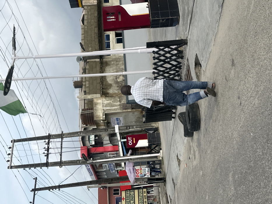 The image depicts an urban street scene in Badore, Nigeria, under an overcast sky
