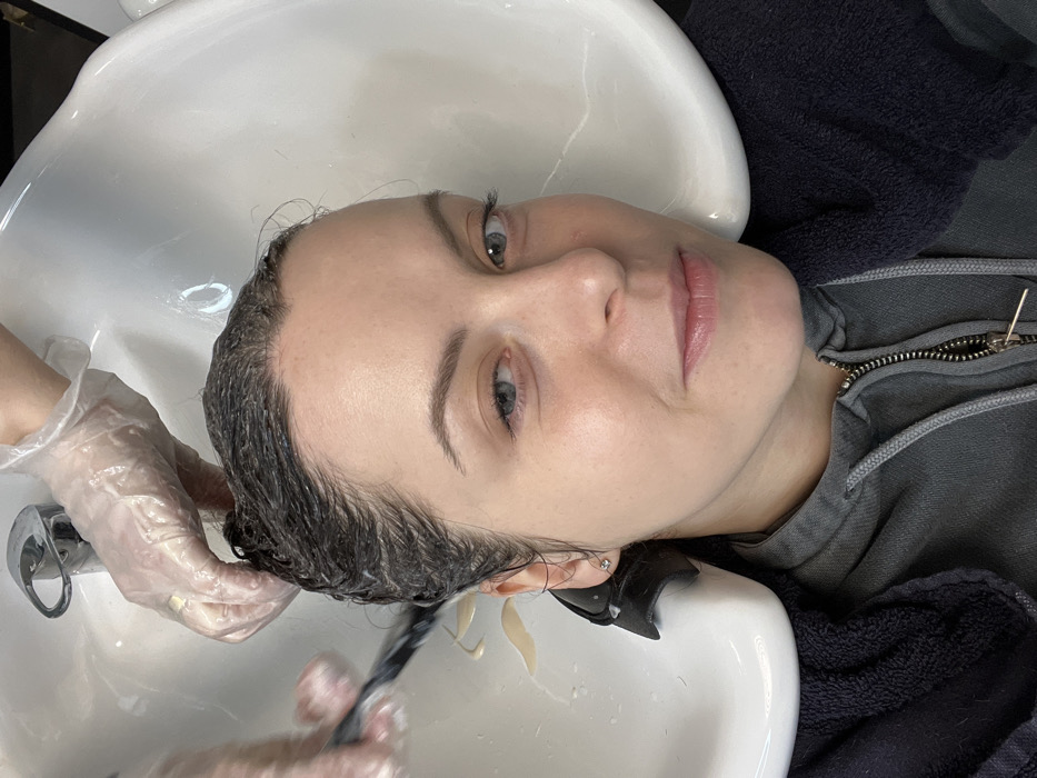 - "The image displays a young adult female, seen from the chest up, positioned in a reclining hair wash basin within what appears to be a salon" by FM-4GKkh1, licensed under CC BY 4.0