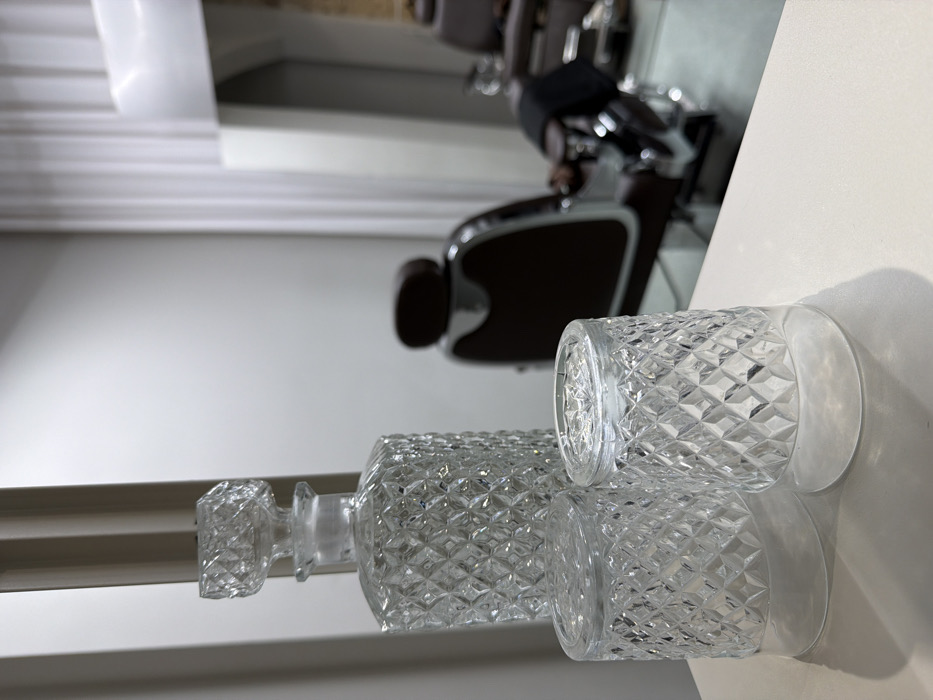 The scene is an interior shot of a barbershop or salon located in Hrodna, Belarus. In the immediate foreground, a clear crystal decanter with a faceted stopper stands upright on a white, reflective surface. To its right, two matching clear crystal tumblers are positioned inverted on the same surface. All three glass items feature a consistent diamond-cut pattern. The background is intentionally blurred, revealing the wider establishment. Two dark brown barber chairs with chrome frames are visible. The closest chair is oriented with its back towards the camera. The second chair, positioned further back and slightly to the right, contains a subject (human or mannequin) draped in dark material. The walls are light-colored, and a vertical white curtain or panel is visible in the background, suggesting a mirror or partition.