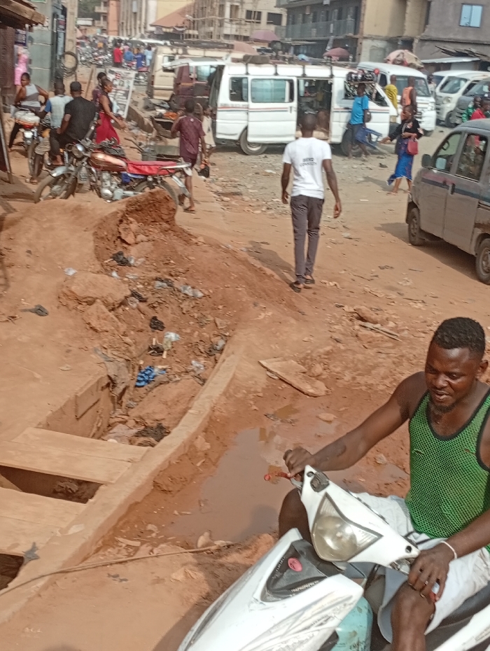 A bustling street scene unfolds with a rough, unpaved road dissected by an uncovered drainage ditch
