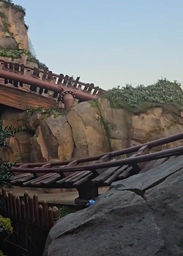 The camera films a roller coaster cart full of people as it careens down a track. The rollercoaster is nestled amongst fake rock outcroppings and shrubbery, and a bit of fencing is visible at the bottom of the frame. The sky above is blue.