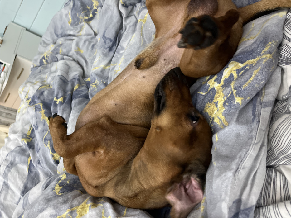 The scene depicts a domestic indoor environment, specifically a bedroom in the city of Razdol'e, Russia. A medium-sized dog, exhibiting reddish-brown fur, is positioned on its back on a bed. The dog's body is inverted and curled, with its limbs bent and paws partially visible. Its head is tilted towards the left, with one eye partially open and directed towards the viewer. The dog's left ear is inverted, exposing its pink internal structure. The animal rests on a duvet cover featuring an abstract pattern of golden-yellow and dark blue forms on a light gray base. A striped white and gray sheet is partially visible beneath the duvet. In the upper right background, out-of-focus white and light blue furniture units are discernible.