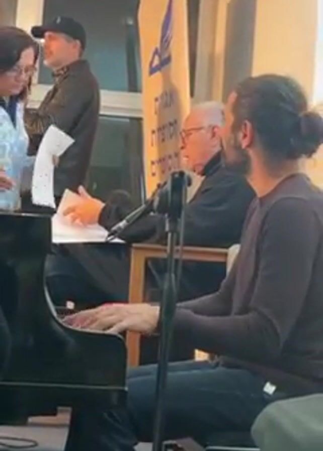 small, indoor gathering. A man with long hair tied back plays a black upright piano, reading music from a paper on the piano. Standing beside him, a woman wearing glasses and a light blue jacket is looking at a paper in her hands, possibly lyrics or sheet music, and occasionally glancing towards the pianist. Another man with a black baseball cap is clapping behind her. Seated in the background is an older man wearing glasses and a black shirt. A banner with Hebrew text and a blue logo stands behind them. A microphone is positioned near the piano, and what appears to be framed photographs are visible in the background, adding a personal touch to the space. Overall, the scene suggests a live performance or rehearsal in a casual, intimate setting.