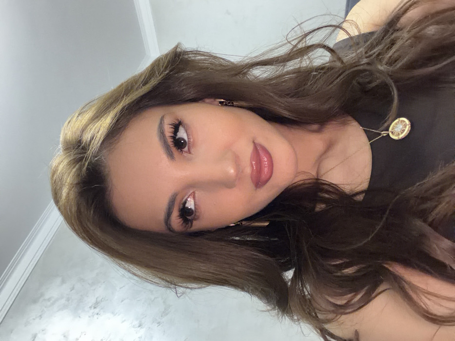A portrait of a female subject, appearing to be a young adult, is depicted indoors