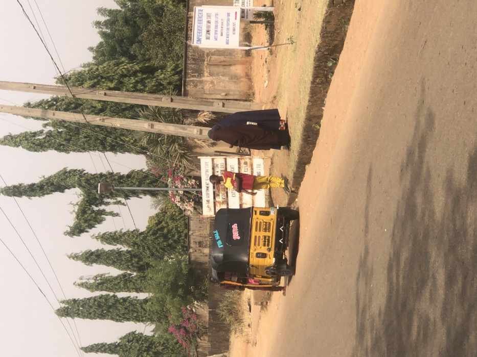 A roadside scene shows a yellow and black auto-rickshaw parked on a paved road