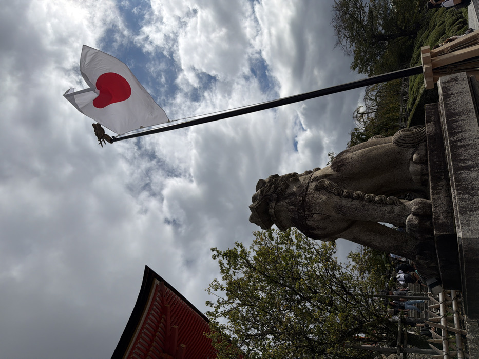 The image depicts an outdoor scene at Kiyomizu-dera Temple in Kyoto, Japan. A large, weathered stone komainu (guardian lion-dog) statue occupies the lower-center, sitting on a stone pedestal and oriented away from the viewer. To its right, a tall black flagpole supports a white Japanese flag (Hinomaru) with a red circle, unfurled by the wind. The flagpole is topped with a golden, ornate finial. In the upper left, a corner of a traditional Japanese temple building with a distinct multi-tiered, deep red roof and dark eaves is visible. Green trees with vibrant foliage are present behind the komainu and to the left. In the mid-ground, a stone staircase ascends, populated by approximately ten individuals in casual attire, some walking and others standing. Further right in the background, a manicured green landscape of sculpted foliage is visible. The sky is partly cloudy, displaying patches of blue amidst prominent white and grey clouds, indicating a bright day.