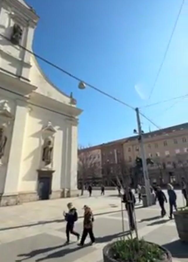 sunny day in a European city. The camera pans across a town square, beginning with a view of a white church with statues on its facade. Several people are walking in the square. The camera then moves to show the rest of the square, which is paved with gray and white tiles and has several large planters with small trees. The square is bordered by several buildings of varying heights and architectural styles. Tram tracks are visible on the pavement. The sky is clear and blue, with the sun shining brightly. Power lines crisscross above the square.