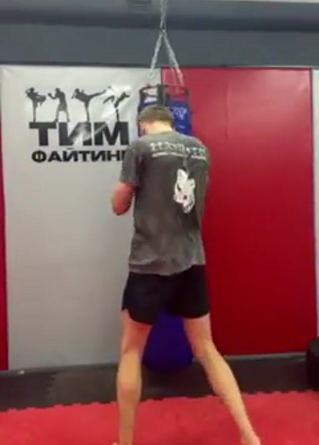 A man is punching a blue punching bag in a gym. He is barefoot and wearing a gray t-shirt and black shorts. The floor is red and the background is a wall with a logo that says “TM FIGHTING” in Russian. There is also a red panel on the wall behind the punching bag. The man throws two punches at the bag then stops.
