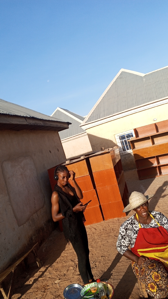 The scene in Tempure, Nigeria, depicts an outdoor area with two individuals and multiple buildings under a clear blue sky with a visible crescent moon. On the left, a young adult female with braided hair, dark complexion, and wearing black over-ear headphones, a black top, black leggings, and a fringed black shawl, stands leaning against a light brown, rough-textured wall. She holds a black smartphone in her right hand and appears to be adjusting her left headphone with her left hand. Her gaze is directed downward. At her feet on the sandy ground, a metal tray holds an empty metal plate, a green leaf, a small plastic cup with clear liquid, and a plastic bottle containing a clear liquid. Behind her, a stack of approximately five light brown, wooden, rectangular units, possibly shelving components, are arranged vertically. On the right, a middle-aged to older female with dark complexion, wearing a straw hat, a white and black patterned top, a red apron with a yellow trim, and a patterned skirt, is seated on a low structure, partially obscured. She looks slightly to the right with her mouth slightly open. Her hands are positioned in her lap, partially out of view. The background features several buildings. Directly behind the seated woman is a light yellow building with a white-framed window. Multiple buildings with gray corrugated metal gable roofs are visible. The ground is composed of sand or dirt, illuminated by direct sunlight which creates strong shadows.
