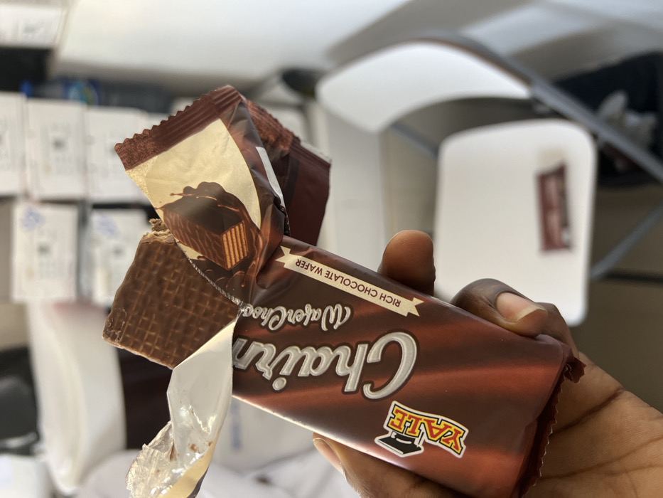 A dark-skinned human hand holds an opened "Chairn Wafer Choco" chocolate wafer bar, displaying a broken section of the dark brown, ridged wafer