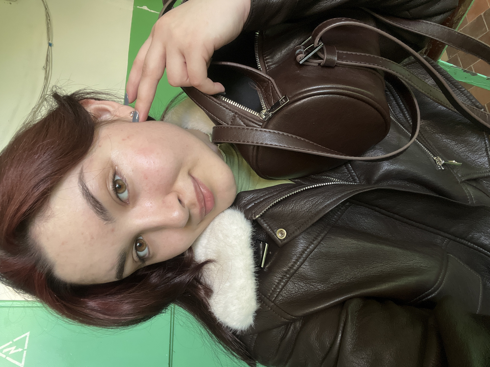 A woman with red-tinted brown hair and fair skin is lying on a green surface, possibly a table or a floor. She is wearing a brown leather jacket with a white fur collar. A small, dark brown leather bag is resting on the jacket, and the woman's hand is near the bag's zipper. The background is slightly out of focus, but appears to be an indoor setting. There is no indication of this image being in Neftekamsk, Russia.