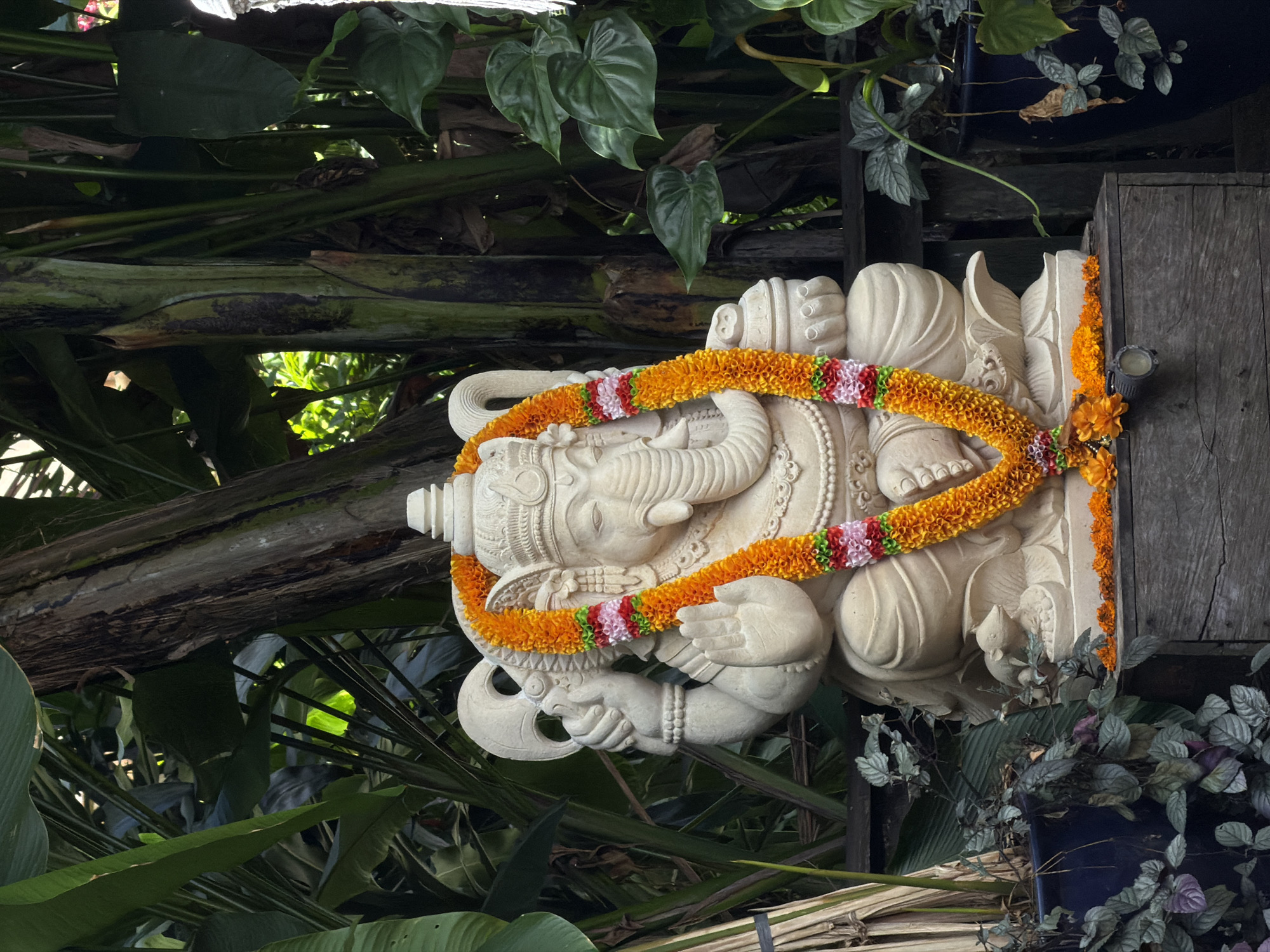 A carved statue of the Hindu god Ganesha, adorned with a marigold and rose garland, is situated in an outdoor garden setting