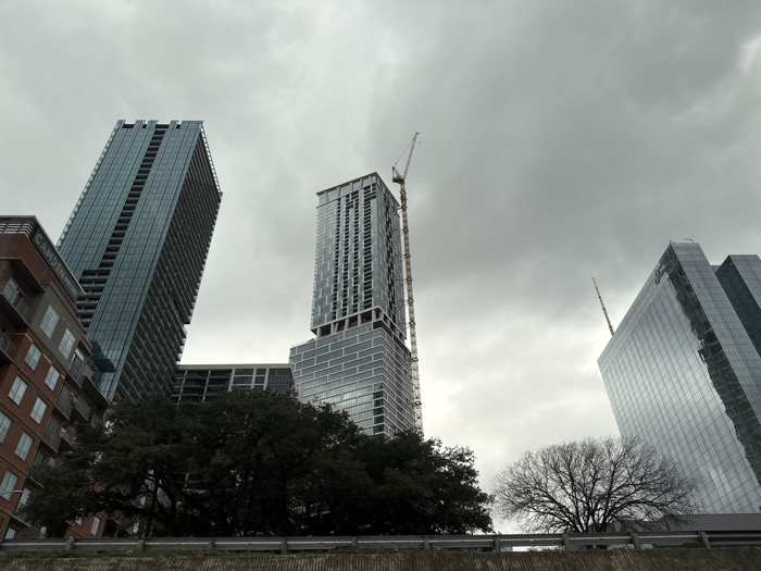 The image captures several modern skyscrapers under a gray, overcast sky