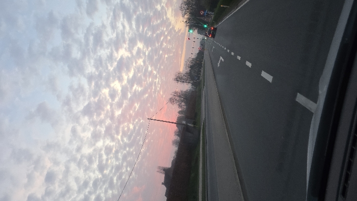 - "The image displays an outdoor road scene in Olen, Belgium, at either sunrise or sunset, viewed from inside a stationary or slow-moving vehicle, evidenced by the visible dashboard in the foreground" by FM-9ctWj1, licensed under CC BY 4.0