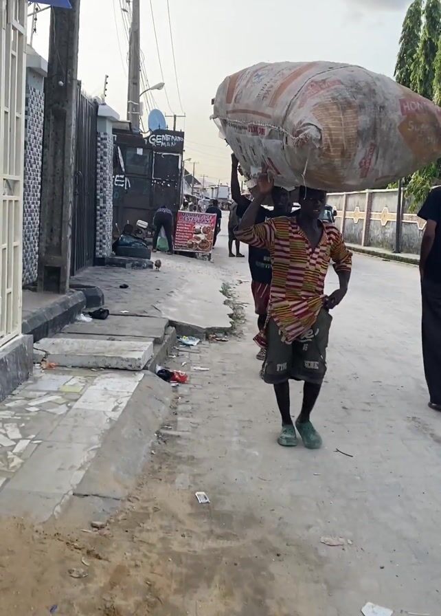 four men walking down a street, each carrying a large sack on their head. The men are dressed in casual clothing. One is wearing an orange t-shirt and using a phone. The sacks appear to be grain sacks, with "GOLDEN PENNY" printed on one. The street is partially paved, with some trash and debris scattered around. There are buildings and fences on both sides of the street, and cars and auto rickshaws can be seen in the background.