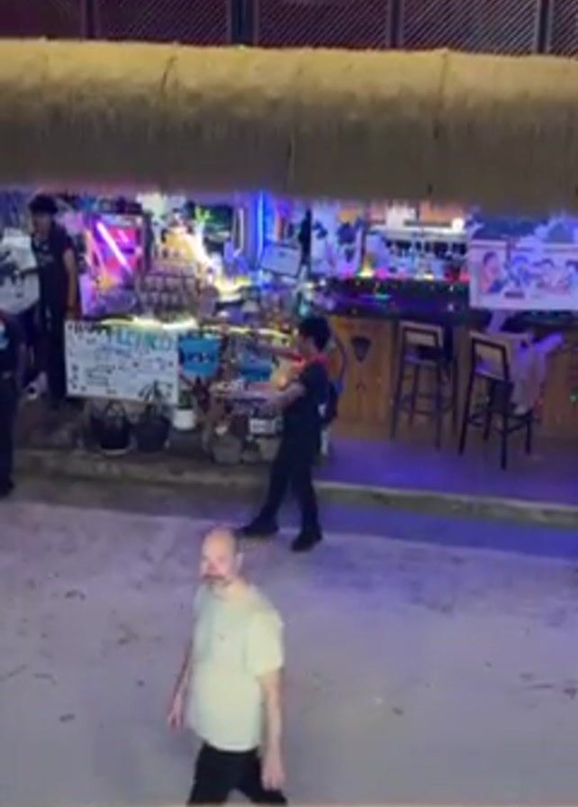 n outdoor bar called "Railay." Two bartenders stand behind a counter decorated with colorful lights. One bartender is wearing a red shirt and black pants and is gesturing with his hands. Another man in a light green shirt and dark pants is walking in front of the bar and looking towards the camera. The ground is paved with light-colored stones. Above the bar, there is a thatched roof overhang.