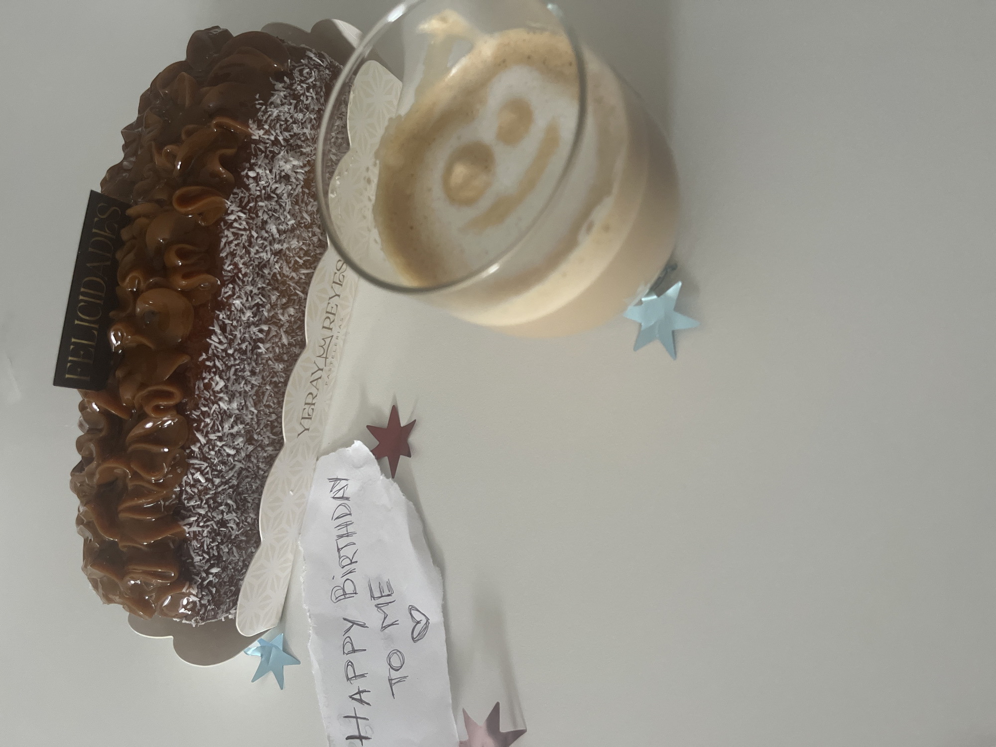 The image depicts a celebratory still life arranged on a light-colored, flat surface in the city of Mogán, Spain. A long, rectangular cake, approximately 20-25 cm in length, rests on a white, scalloped paper tray labeled "YERAY & REYES PASTELERIAS." The cake features a dark brown base, covered with white shredded coconut along its sides, and topped with thick, piped caramel-colored frosting. A small, black rectangular plaque with the word "FELICIDADES" in gold lettering is inserted vertically into the cake's frosting. To the left of the cake, a torn piece of white paper bears the handwritten message "HAPPY BIRTHDAY TO ME" followed by a small heart symbol. In the lower right foreground, a clear glass contains a light brown beverage, likely coffee or a latte, topped with white foam that features a simple smiley face pattern. Several small star-shaped confetti, some light blue and some reddish-brown, are scattered across the surface around the items.