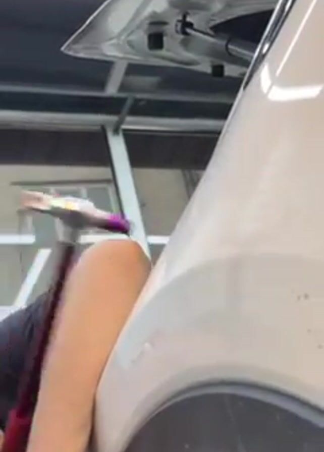 A person in a black shirt is shown holding a red hammer with a multicolored metal head. They are hitting the white body of a vehicle, specifically the area above the black wheel well. The vehicle's trunk is open. The setting appears to be an indoor garage or shop space with a gray roof and window.