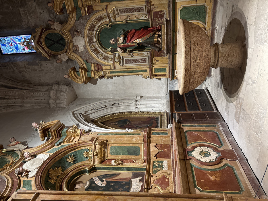 This image depicts the interior of the Cathedral of Cuenca, Spain. In the foreground, a large, ornate carved stone baptismal font stands on a pedestal, casting a distinct shadow on the light-colored stone floor. To the left, an elaborate wooden altarpiece, featuring reddish-brown and green panels with extensive gold trim, displays a painted panel depicting a male figure in dark robes holding a scroll. Multiple carved cherubic figures are affixed to the upper sections of this altarpiece. To the right, a second, similarly ornate wooden altarpiece houses a polychrome statue of a bearded male saint, dressed in a red cloak and green tunic, holding a prominent staff or cross. Above this right altarpiece, a rectangular stained-glass window exhibits abstract or figurative designs in blue, red, and yellow hues. The background consists of rough, light-colored stone walls with visible pointed Gothic arches and carved architectural elements. Dark wooden chests of drawers are situated in an arched recess between the two altarpieces. The scene is illuminated by indirect lighting, accentuating the decorative and architectural details. No living individuals are present.