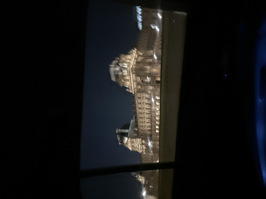 At night, through a window, the illuminated Louvre Museum in Paris is visible