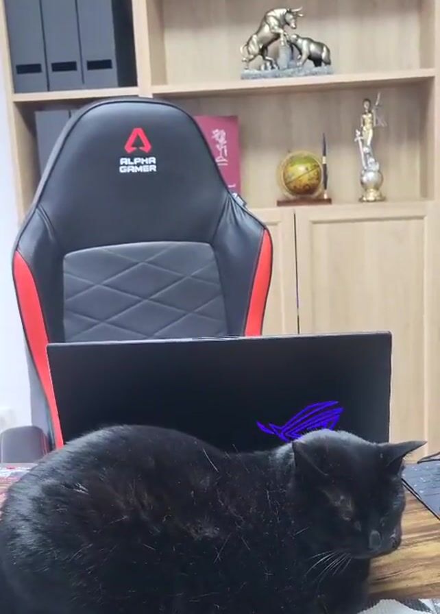 black cat lying on a desk in front of a laptop. The laptop is black and has a glowing logo on the back. Behind the desk is a black and red gaming chair with the words "ALPHA GAMER" on the back. Behind the chair is a bookshelf with various items on it, including figurines, binders, and decorative objects. The cat is mostly still, though it does open its eyes near the end of the video. The desk has a patterned surface. The lighting is bright.