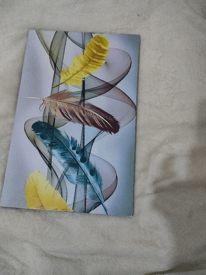 A rectangular piece of paper, displaying an abstract print of four feathers, rests diagonally on a light beige, textured fabric surface. The print features two yellow feathers, one brown feather, and one blue-green feather, arranged vertically and superimposed over swirling translucent dark grey ribbon-like elements against a light blue-grey background. The paper exhibits minor edge wear, particularly at the bottom right corner. No individuals or additional distinct objects are visible in the frame. The scene is situated in Juja ward, Kenya.