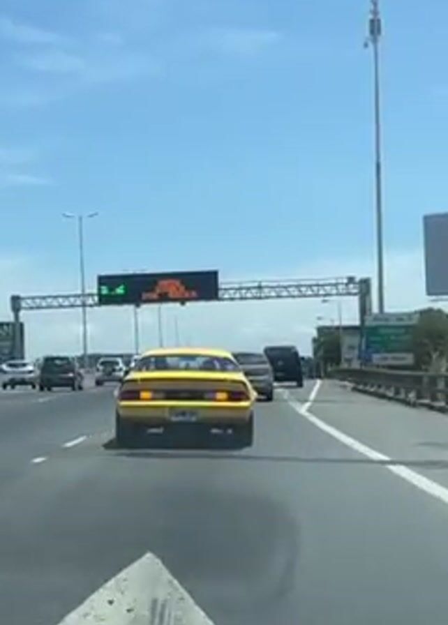 rear view of a yellow Chevrolet Camaro driving on a highway with several lanes. There are other vehicles on the road, and an overhead electronic traffic sign displaying information. The sky is blue with some clouds. There is road infrastructure visible, including lampposts, towers, and highway signs. The camera is inside a car.