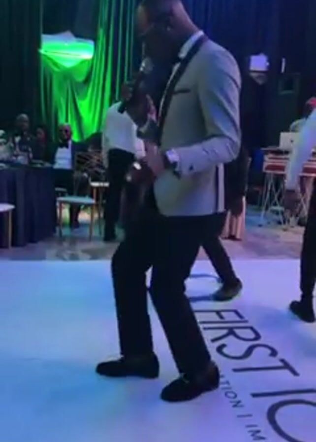 A man in a light gray suit and black shoes is dancing on a white dance floor that has the words "FIRST" and "INNOVATION | IMPLEMENT" written on it. He is holding a microphone and appears to be singing. There are other people on the dance floor with him, and behind him, there are tables with people seated at them. The room is decorated with green and blue lighting.