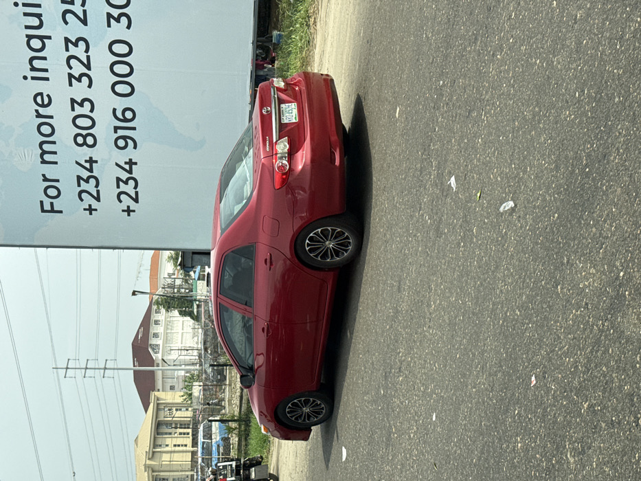 A red Toyota Corolla sedan, bearing Nigerian license plate KRD 452HE, is stationary on a paved asphalt road in Ilado, Nigeria