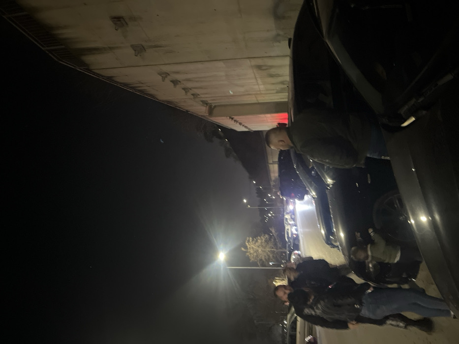 The image depicts an outdoor night scene in an urban or semi-urban area within Varna, Bulgaria. The environment is illuminated by artificial streetlights and vehicle lights. On the right side of the frame, a tall, weathered concrete retaining wall with a metal railing at its crest extends diagonally into the background. Several structural elements or drainage spouts are visible along its surface. Beyond the wall and in the background, a hillside with sparse, bare trees is discernible under the dark sky. In the mid-ground and foreground, a paved surface functions as a street or parking lot, populated by numerous parked and potentially moving vehicles. Predominantly, dark-colored sedans and SUVs are visible. A black sedan with distinct alloy wheels is central to the immediate foreground. A group of individuals is present on the left side of the frame. An adult male with a dark jacket stands with his back partially to the camera, facing a woman in a dark jacket and blue jeans. A young child in a light-colored jacket stands near the front bumper of the black sedan, touching its surface. Another adult figure is partially visible behind the woman. Further to the right, a stocky adult male with a shaved head, wearing a dark olive-colored jacket, stands with his back mostly towards the camera, positioned beside another black vehicle. The scene is dominated by the artificial glow of a prominent streetlight in the mid-left, which emits a strong lens flare. Headlights and taillights from other vehicles are visible in the background, contributing to the overall illumination. The sky is dark with minimal visible celestial bodies.