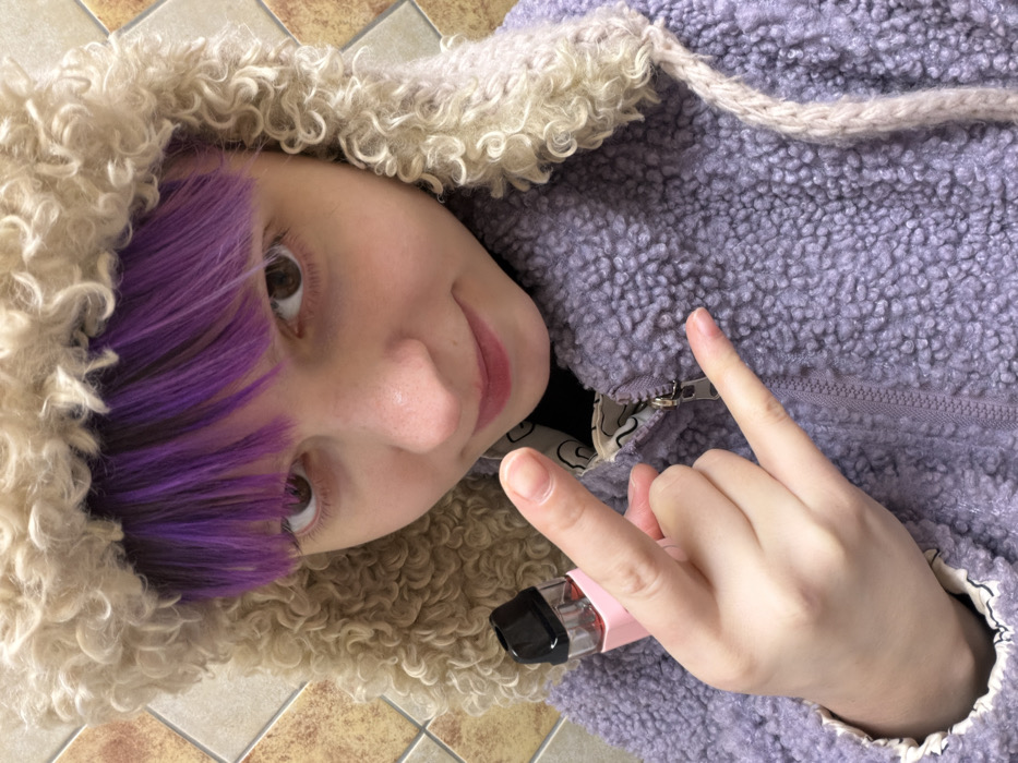 An indoor close-up image depicts a person with light skin, brown eyes, and bright purple bangs, looking directly at the camera with a slight smile. They wear a light beige, curly-pile textured hat and a light purple, shaggy fleece zippered jacket over a dark undergarment, with a patterned cuff visible. The individual holds a pink electronic nicotine delivery system (vape device) in their left hand, simultaneously forming a "devil horns" hand gesture with extended index and pinky fingers. The vape device has a dark mouthpiece and a visible reddish liquid. The background consists of a tiled wall with square ceramic tiles in various light brown and beige tones. The exact city and specific location within Unknown, Unknown are undetermined.