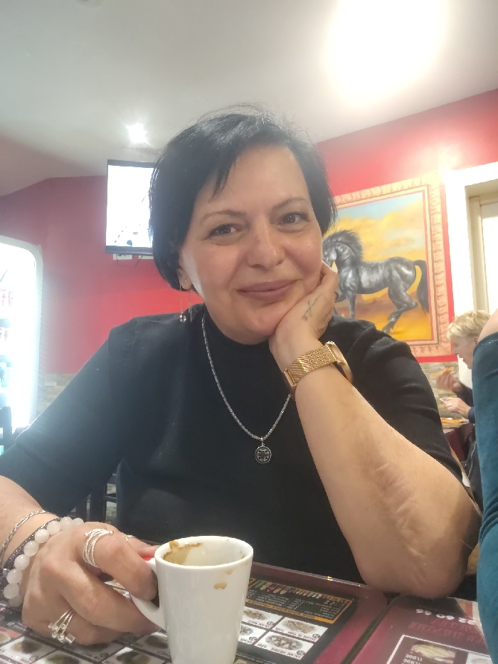 A middle-aged woman with short dark hair is seated at a table in a restaurant or cafe located in Strasbourg, France